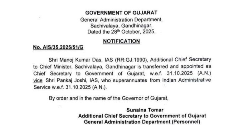 मनोज कुमार दास को गुजरात का नया मुख्य सचिव नियुक्त किया गया है। वे 1990 बैच के वरिष्ठ IAS अधिकारी हैं और पंकज जोशी की जगह लेंगे। IIT खड़गपुर से बी.टेक करने वाले एम.के. दास के पास 30 वर्षों का प्रशासनिक अनुभव है।